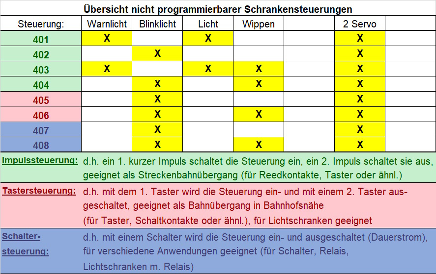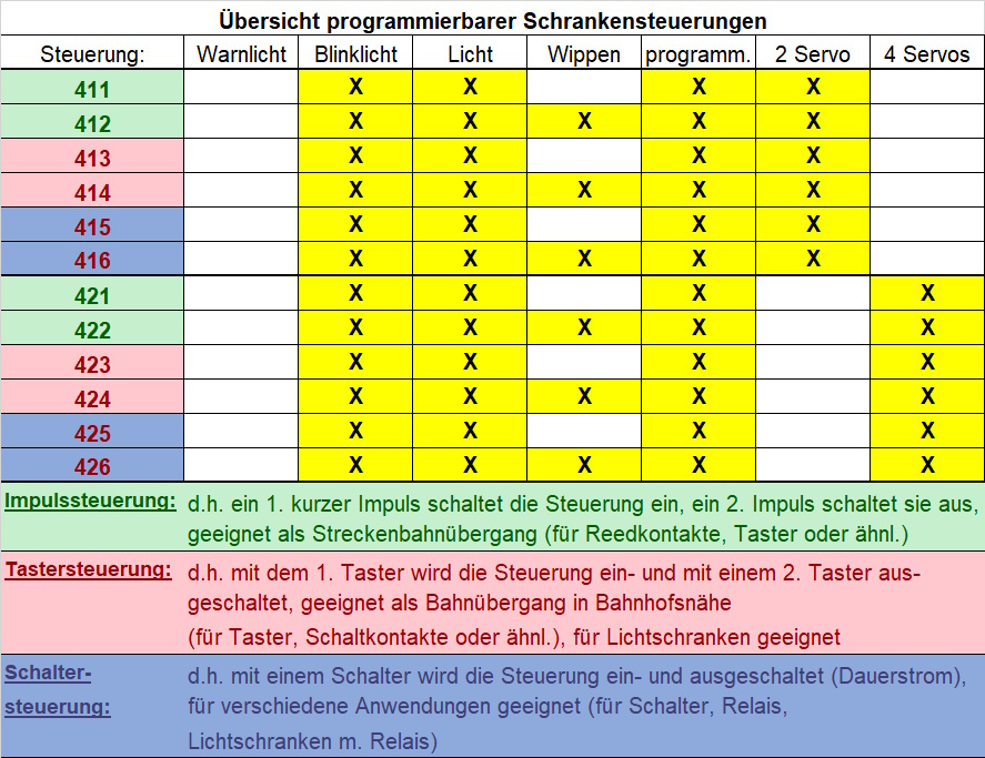 Die Steuerung eignet sich für ein- und zweigleisige, bahnhofsnahe und Strecken-Bahnübergänge. Wird die Steuerung bei einer zweigleisigen Strecke verwendet, so sind die Gleise untereinander "verriegelt", so dass die Schranken erst öffnen, wenn beide Schalter aus sind. Die Startstellung, beim Einschalten der Anlage, ist immer mit geöffneten Schranken. Es gibt also kein Anfangszucken der Servos.