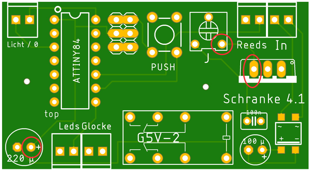 Hat man nun kein separates Netzteil mit 5 Volt zur Verfügung, so kann man sich behelfen indem man die Plus 5 Volt vom Schrankenmodul abnimmt. Dafür kann man an den mit einem roten Kreis gekennzeichneten Punkten ein Kabel anlöten (dafür übernehme ich dann aber keinerlei Garantieansprüche mehr, wenn es zu Beschädigungen des Moduls kommt!) und hat dann die benötigten Plus 5 Volt für das Soundmodul. Die Platinenansicht ist hierbei von oben (Bestückungsseite).
